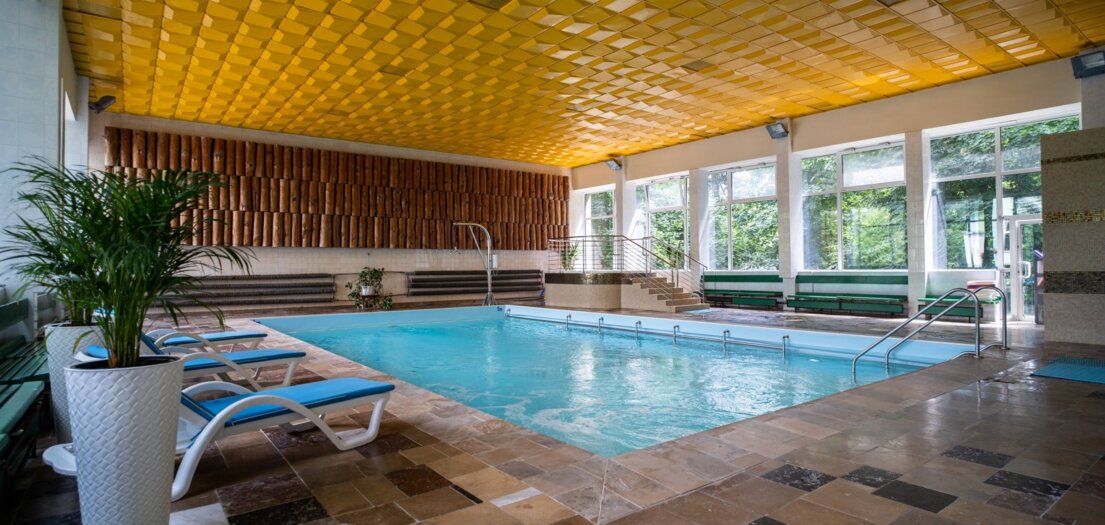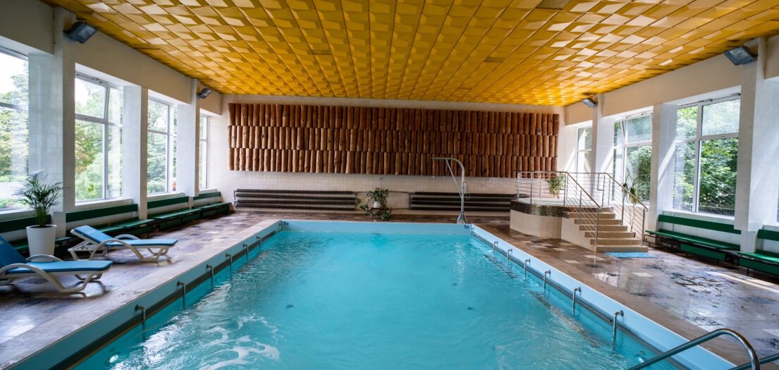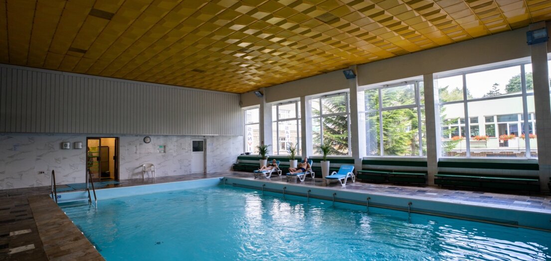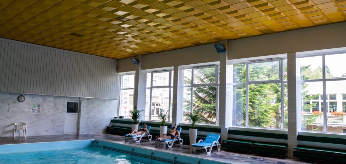 Basen z masażem podwodnym o wymiarach 13/9 metrów i głębokości od 1,25 m do 1,35 m udostępniany w celach rehabilitacyjnych jak i rekreacyjnych.
